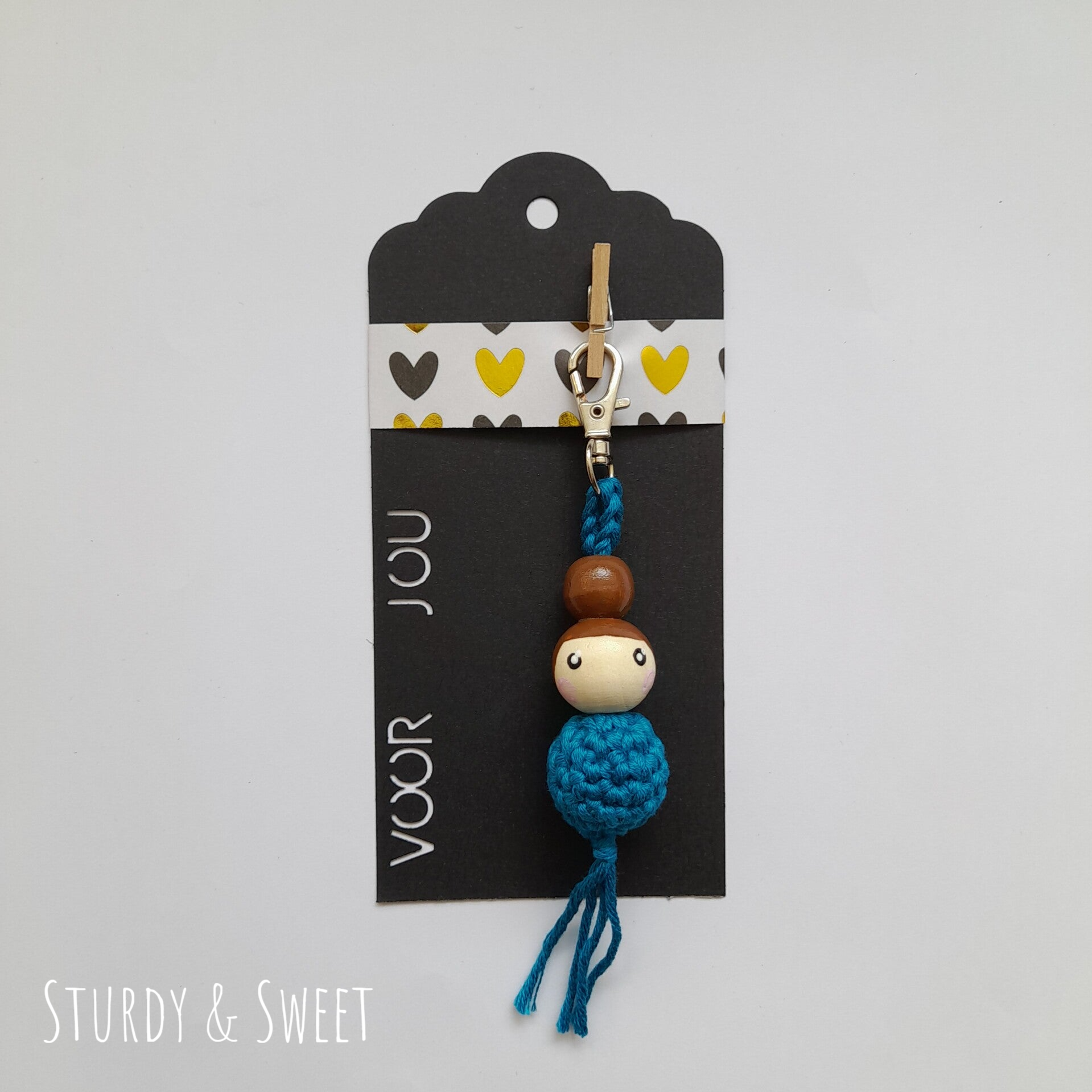 Los bij te bestellen voor €0,25. Ik maak het gelukspoppetje met een knijpertje aan het label en pak hem in een zakje in.