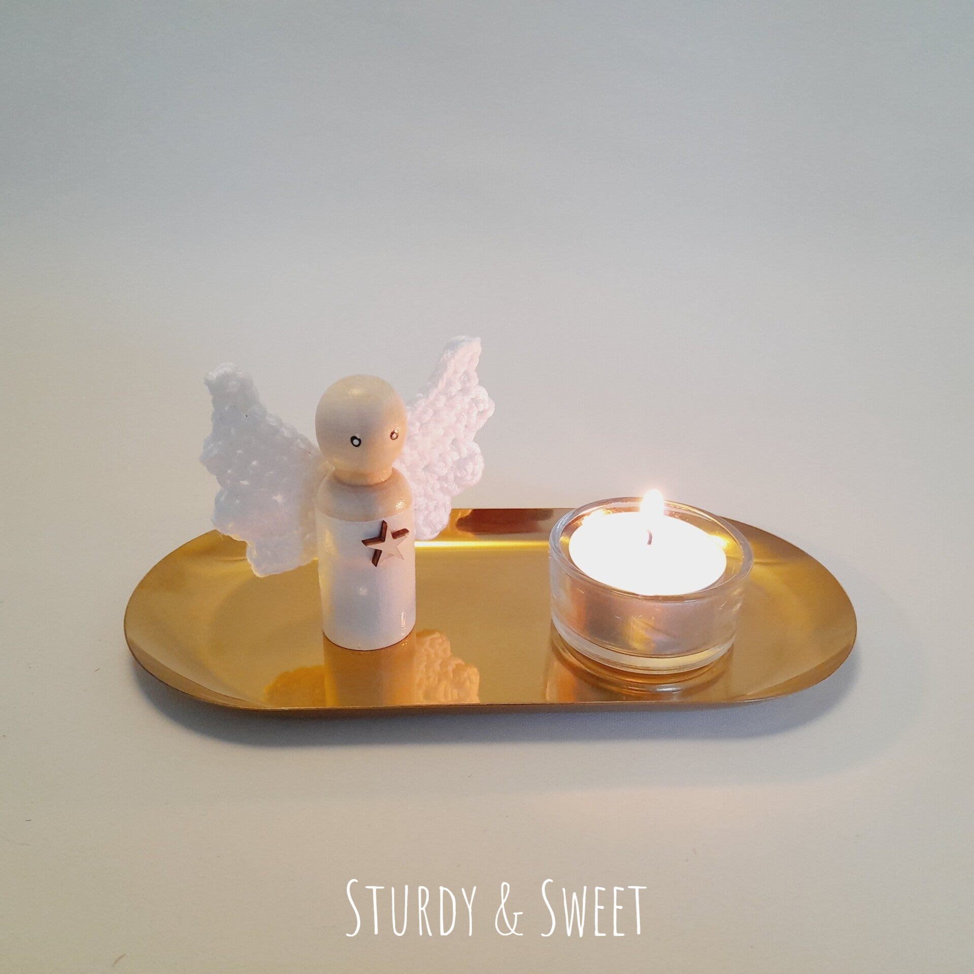 Engeltje met waxinelichtje op een gouden schaaltje