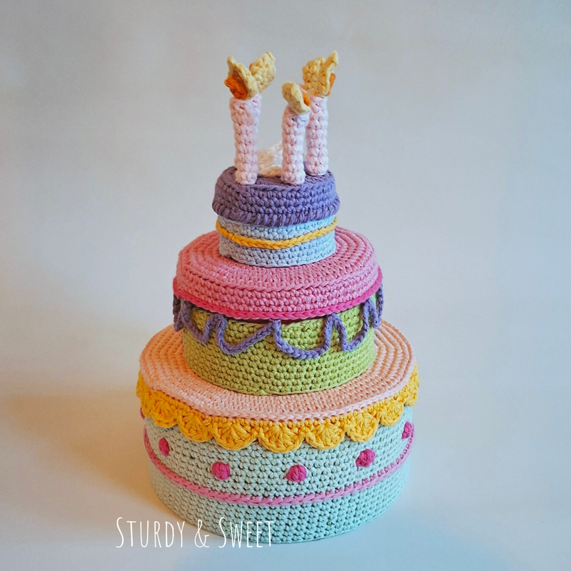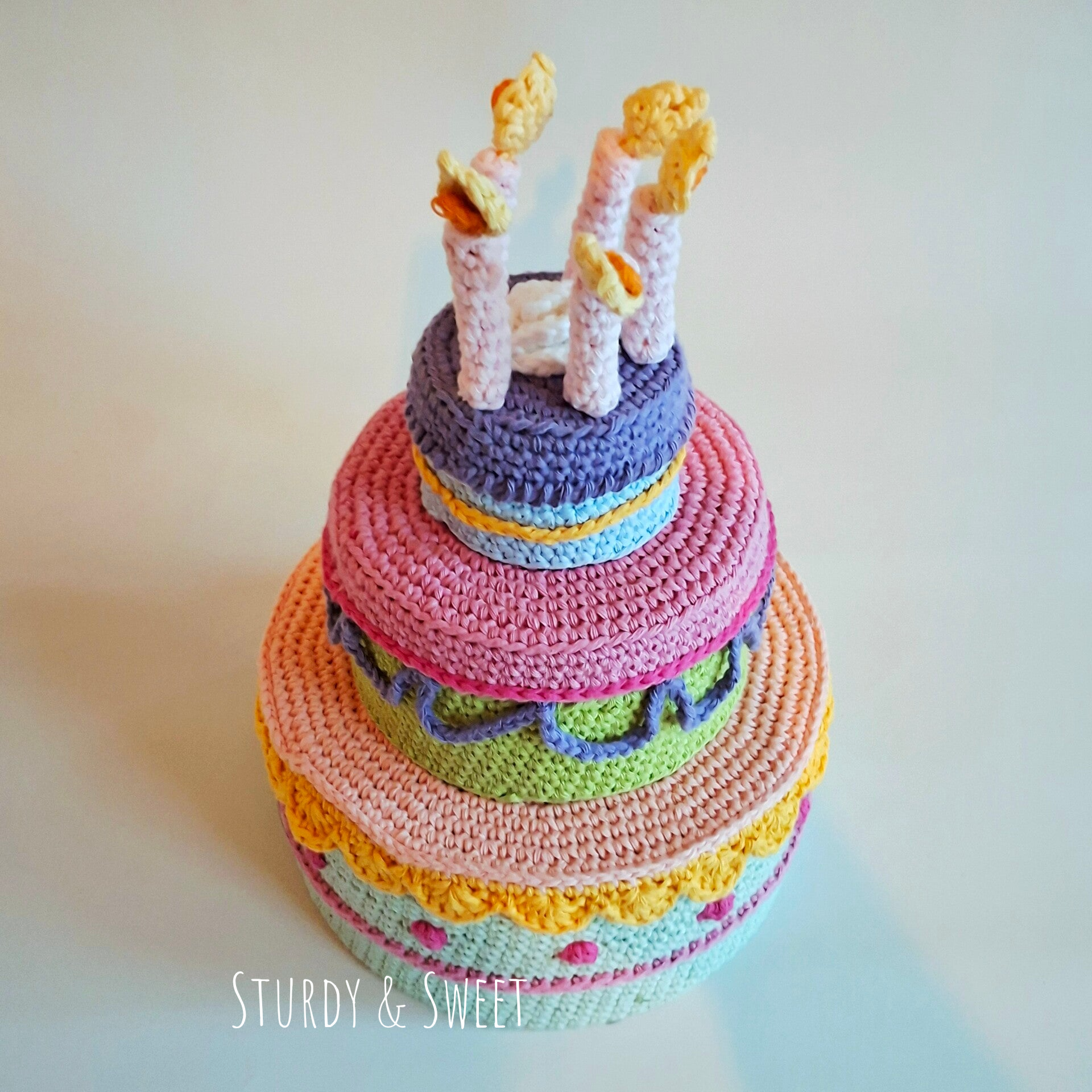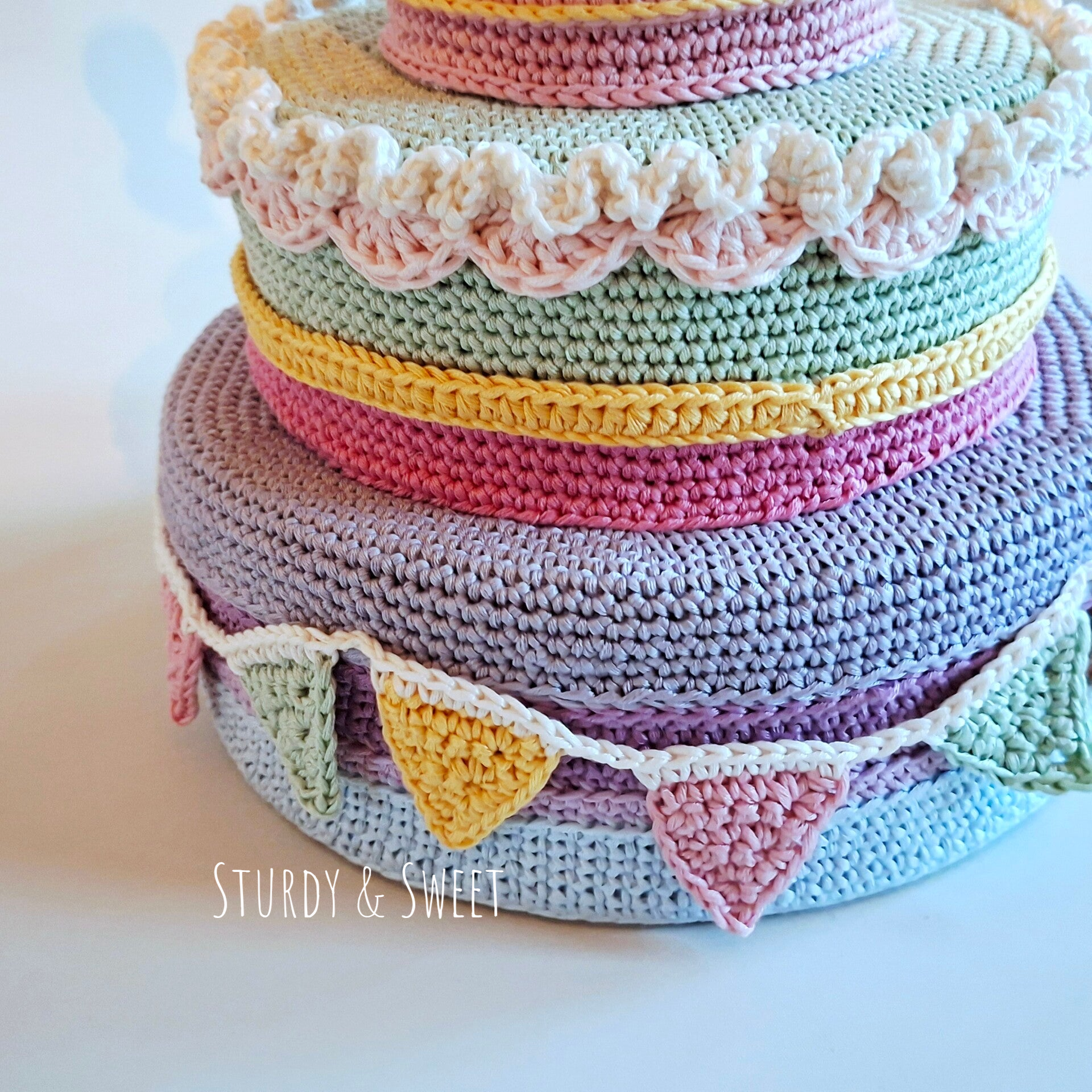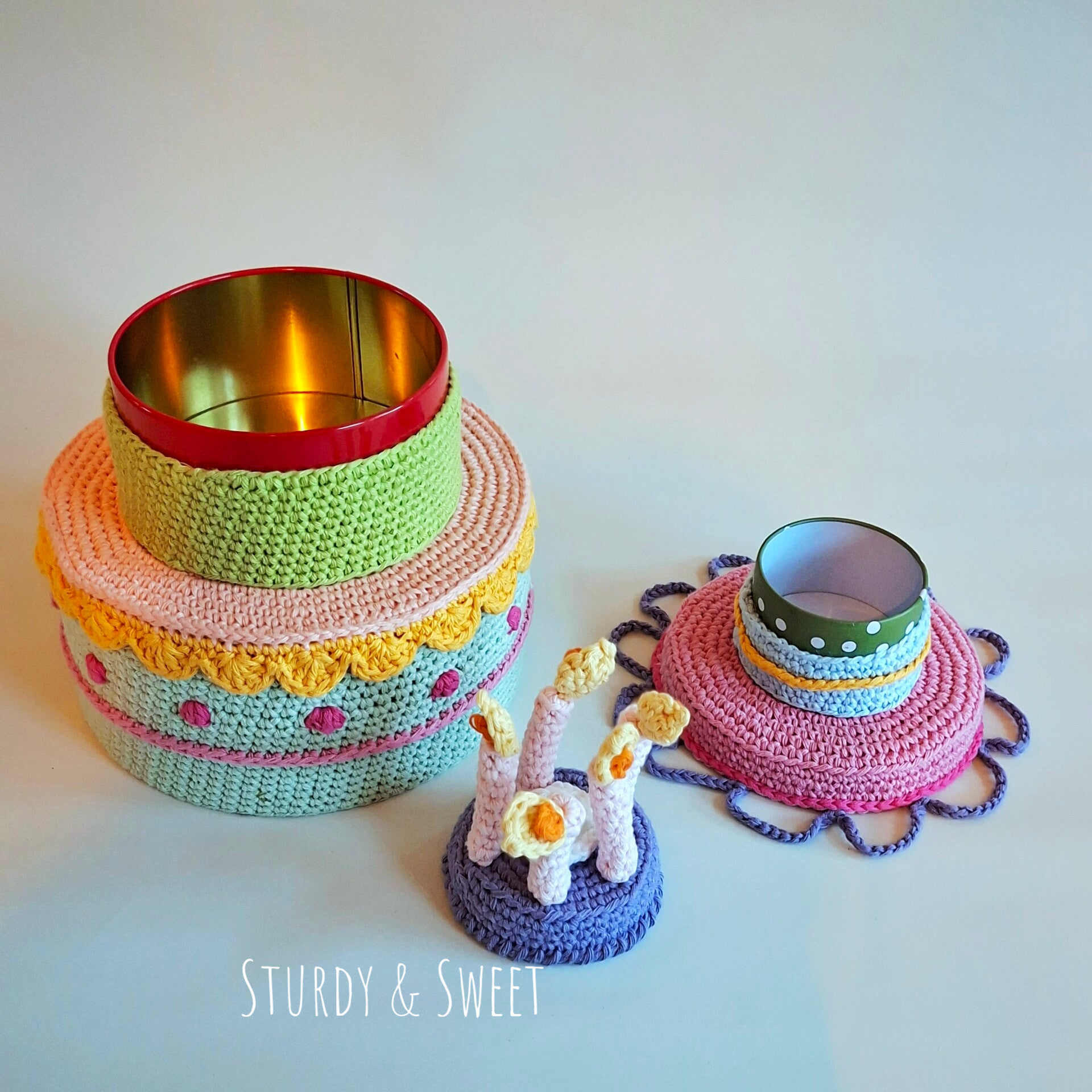 Gehaakte taarten met als basis koekblikken. Te gebruiken op bijvoorbeeld kinderdagverblijven, BSO, scholen, etc.
